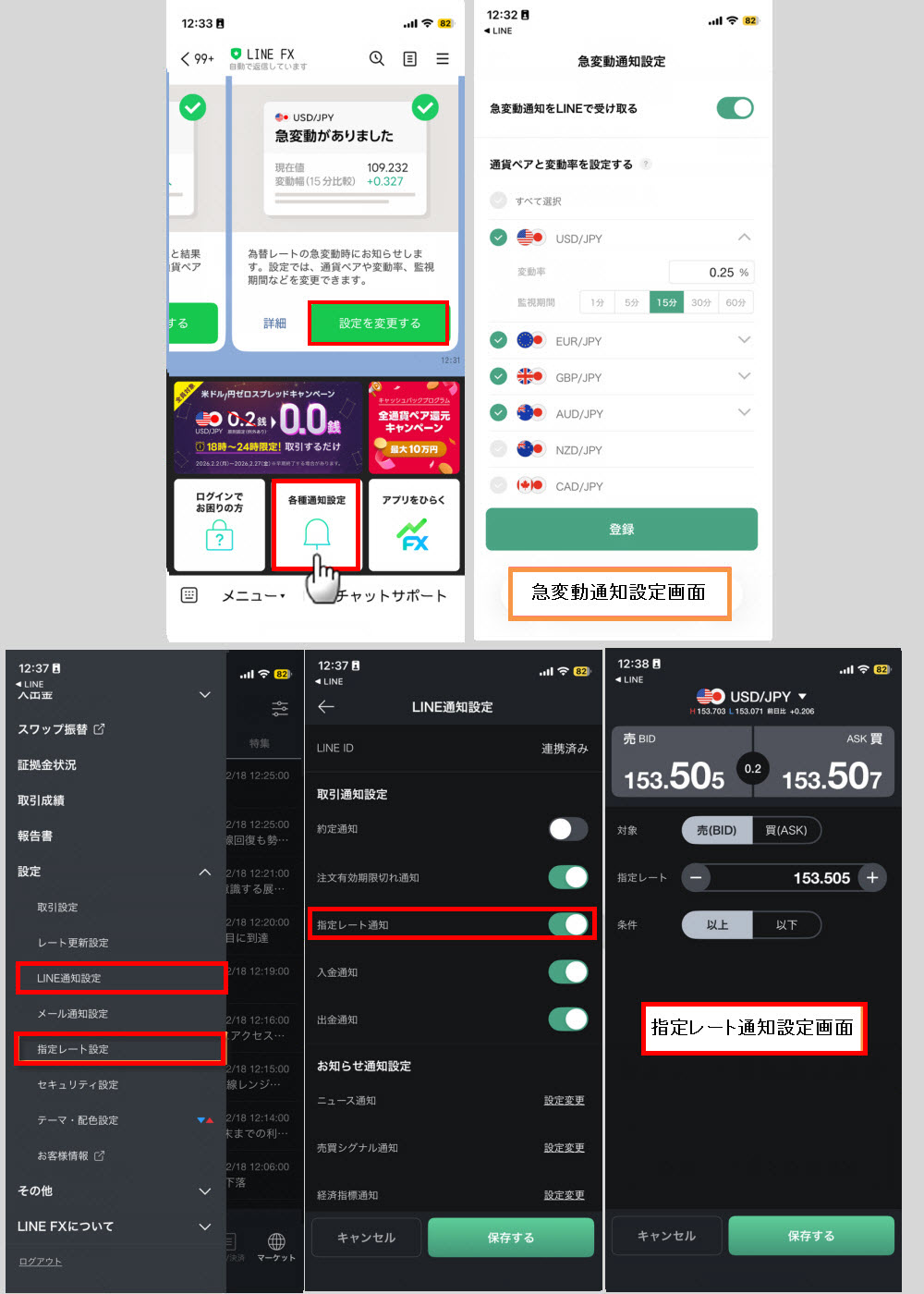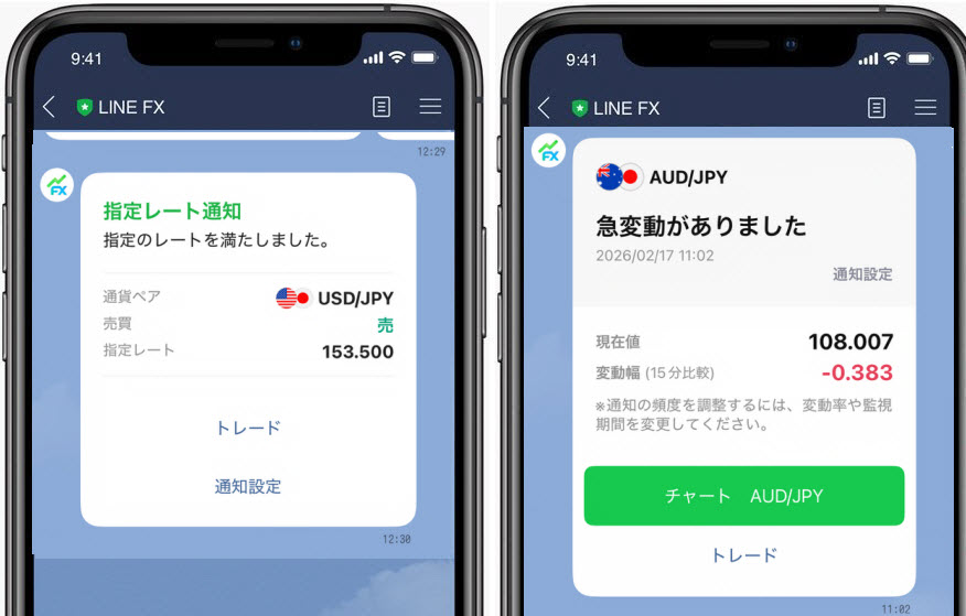 ・急騰急落アラートはLINEトーク画面、指定レートアラートはスマホアプリ『LINE FX』で設定する