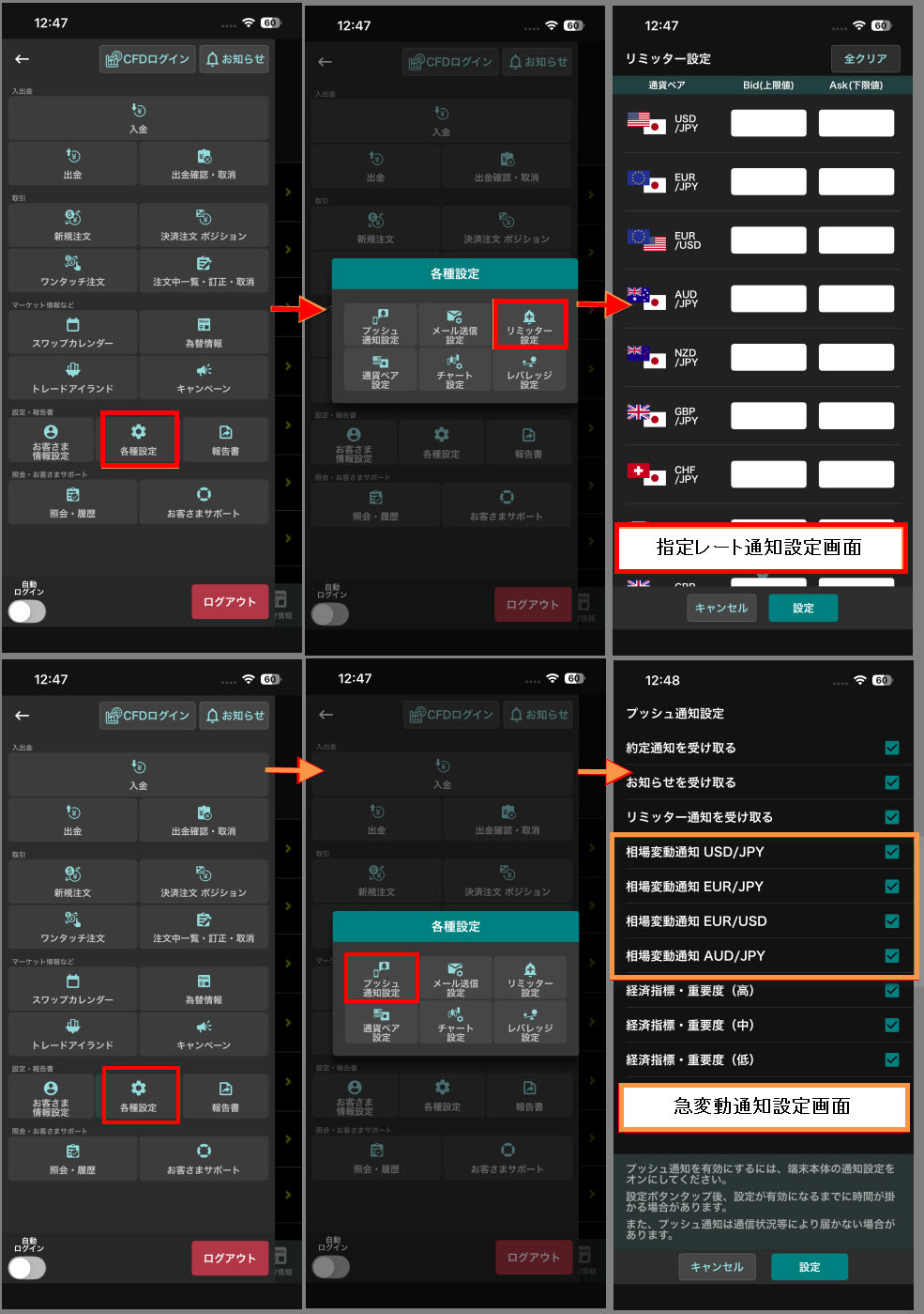 ・レート通知/レート変動/約定/経済指標/ロスカット/アラート通知の6種類のプッシュ通知に対応