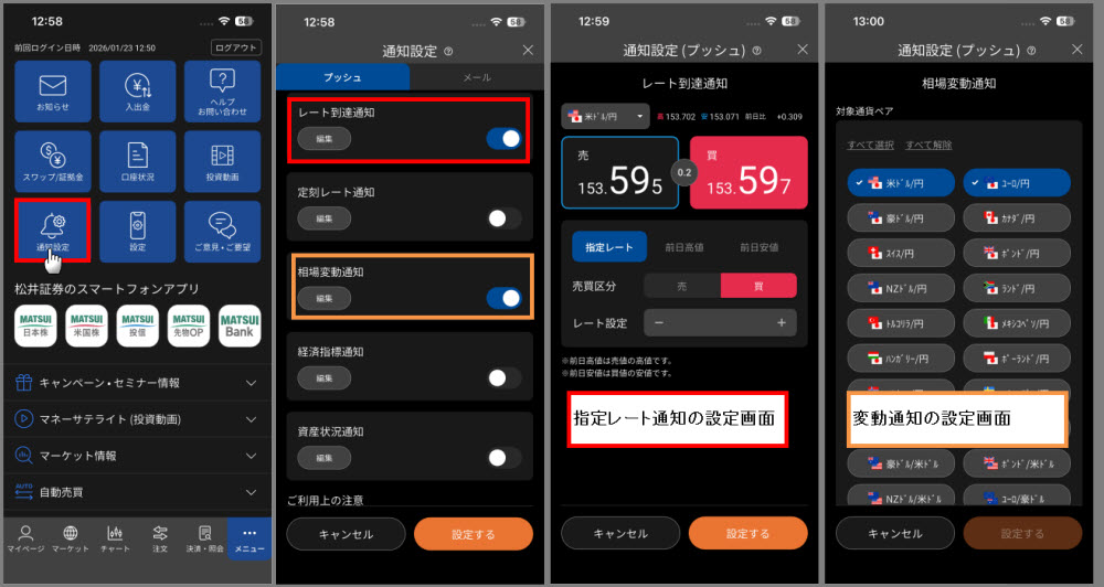 ・ジャストレートは下3桁が000や500に達した場合にプッシュ通知が届くのでラウンドナンバー狙いの取引の目安におすすめ