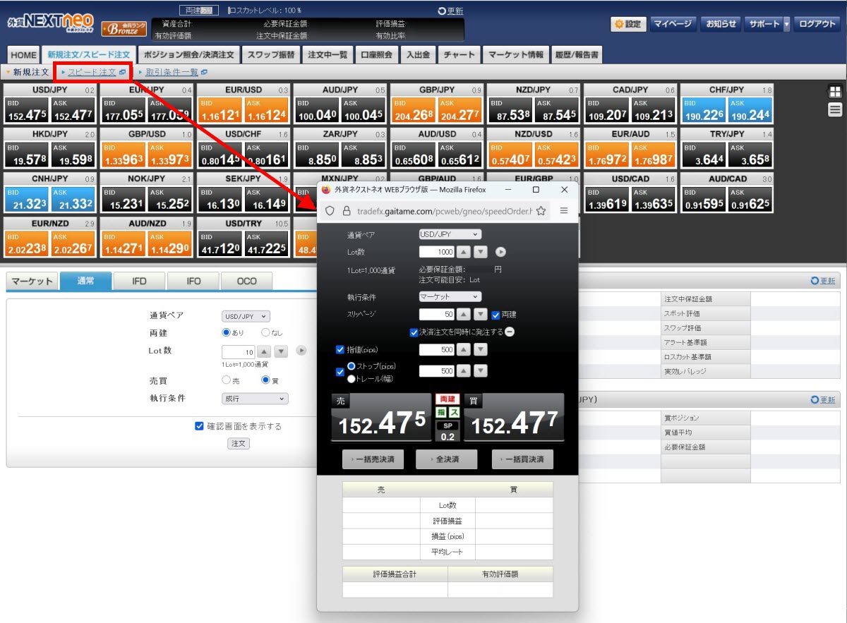 外為どっとコム[外貨ネクストネオ]のスピード注文機能を紹介!【スピード注文は発注とポジション管理が1画面で可能で素早いFX取引に最適】[※2025年11月5日最終更新]
