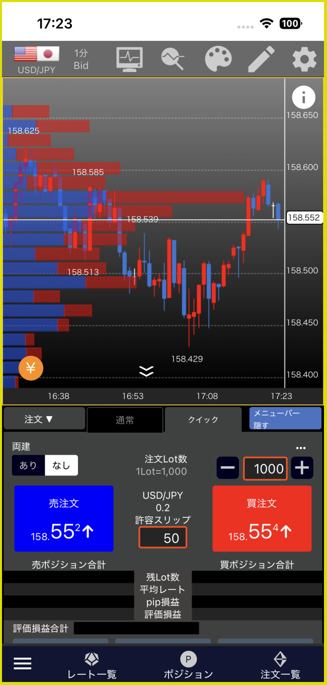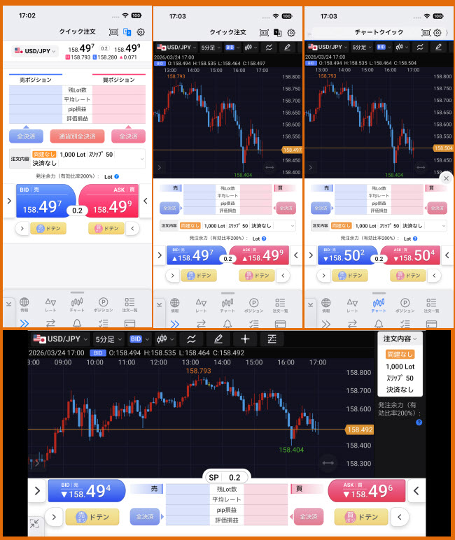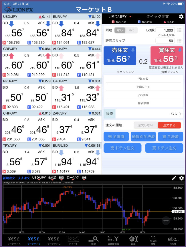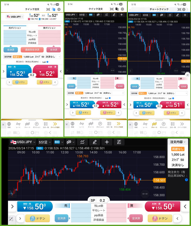 新アプリ「LION FX5」は、2024年6月にクイック注文画面に切替しなくても、チャート画面からクイック注文ができるようになりました。