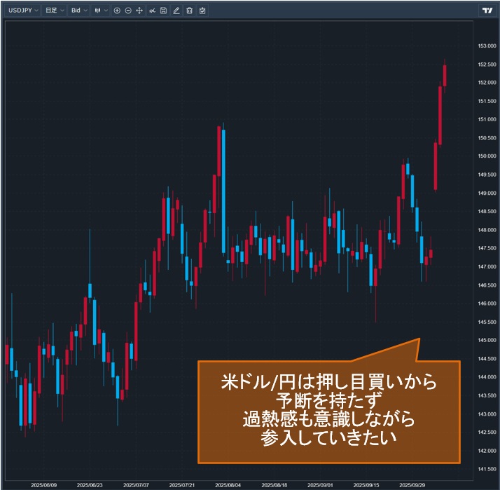 米ドル/円は押し目買いから、予断を持たず、過熱感も意識しながら参入していきたい。