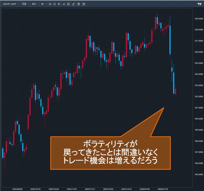 なにはともあれボラティリティが戻ってきたことは間違いなく、新安値でも反発でもトレード機会は増えるだろう。