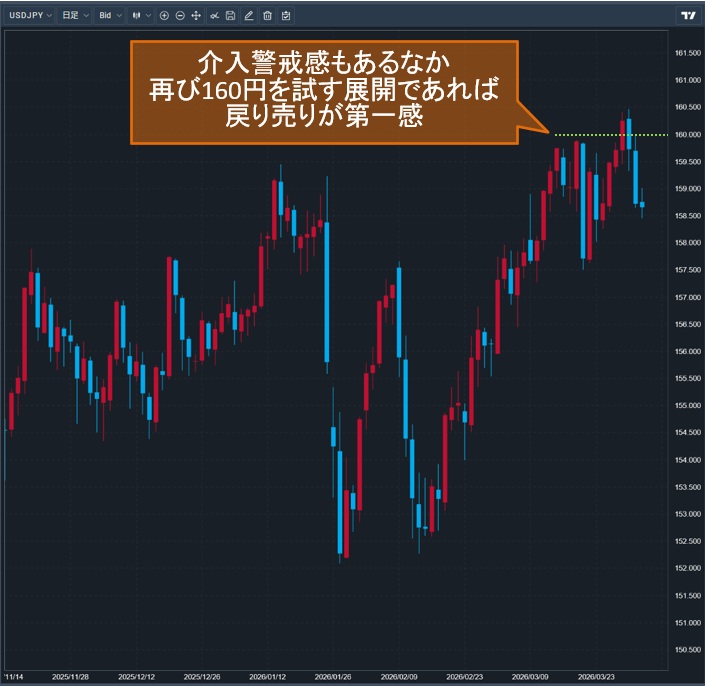 引き続きイラン情勢次第ではあるが、米ドル/円は160円台をつけたことで一定の達成感がでたほか、米、イラン双方から終戦の発言が聞こえており「有事のドル買い」の巻き戻しも意識しなければならないフェーズとなっている。