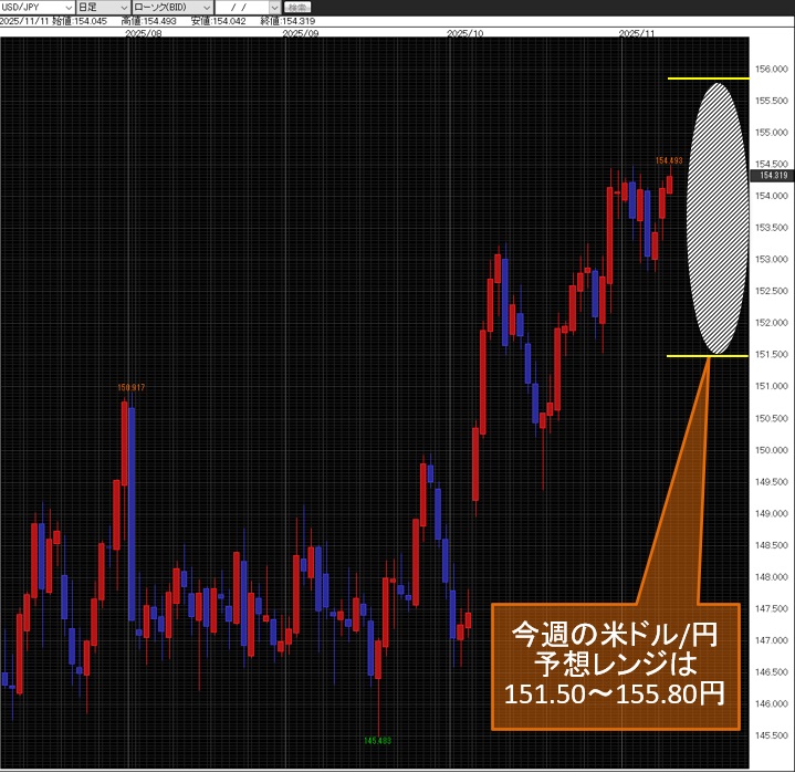 今週の米ドル/円予想レンジは、151.50~155.80円。
