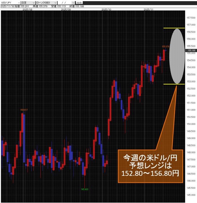 今週の米ドル/円予想レンジは、昨日17日(月)日本時間未明に考えたのが152.80~156.80円。