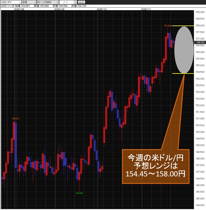 今週の米ドル/円予想レンジは、154.45~158.00円。