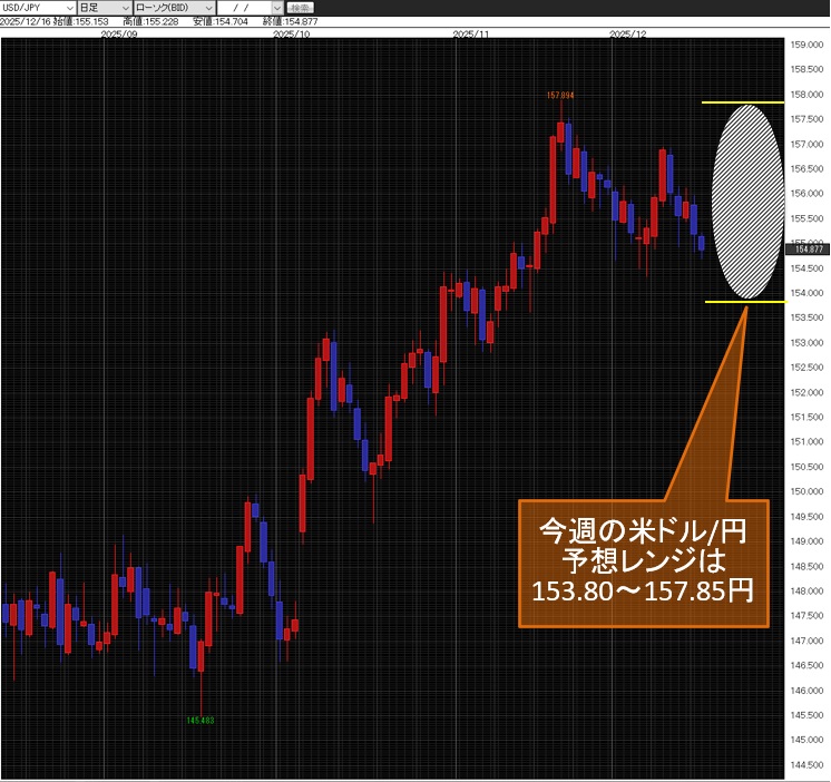 今週の米ドル/円予想レンジは、153.80~157.85円。