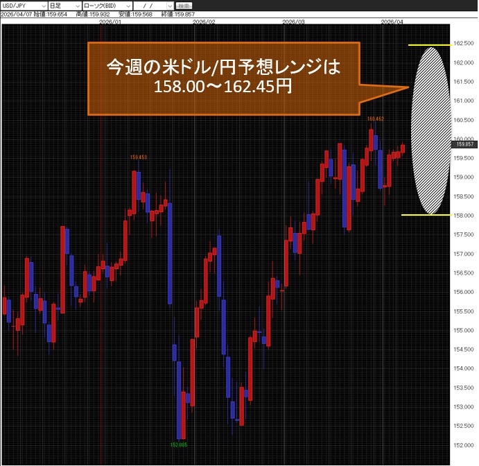 今週の米ドル/円予想レンジは、先週同様158.00~162.45円。