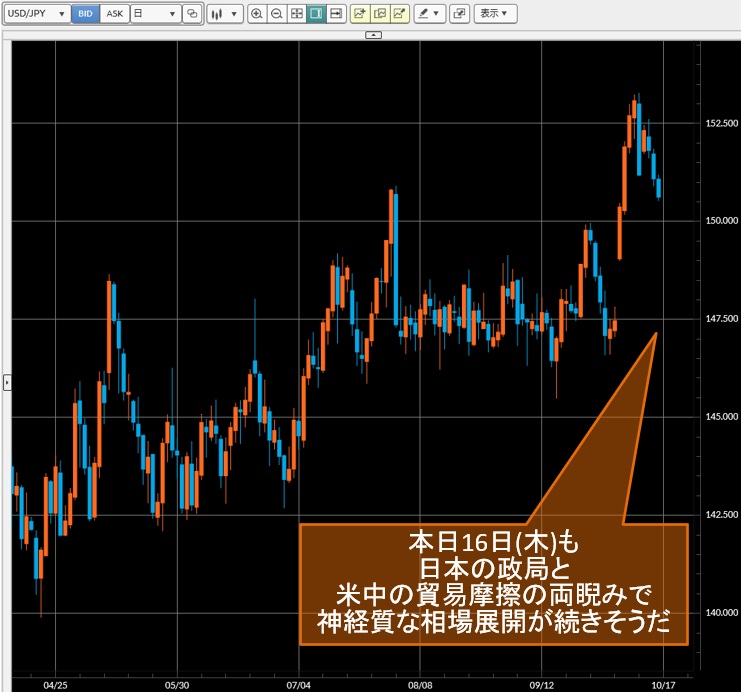 いずれにせよ、米ドル/円は本日16日(木)も、日本の政局と米中の貿易摩擦の両睨みで神経質な相場展開が続きそうだ。