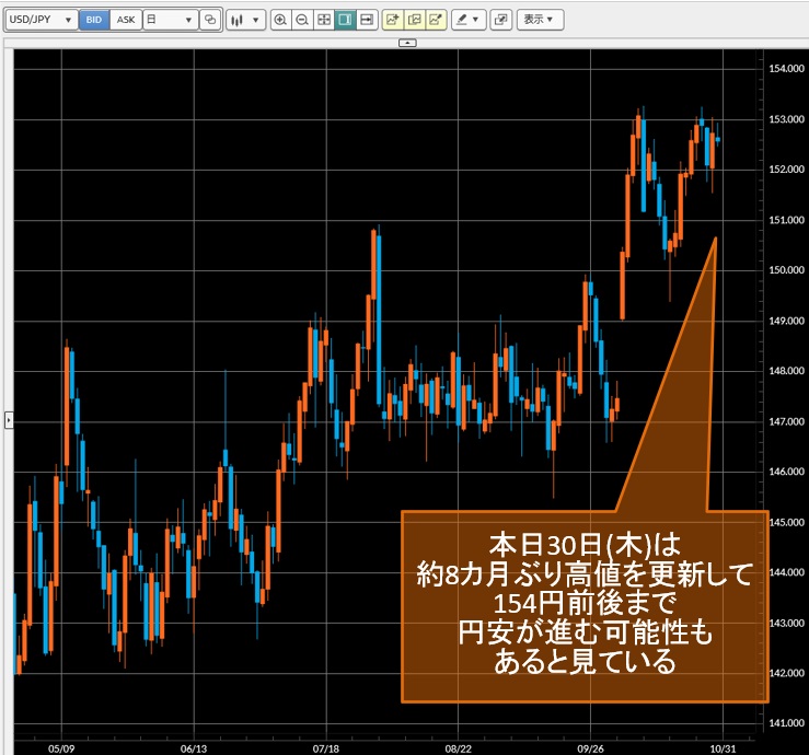 本日30日(木)の米ドル/円は約8カ月ぶり高値を更新して154円前後まで円安が進む可能性もあると見ている。