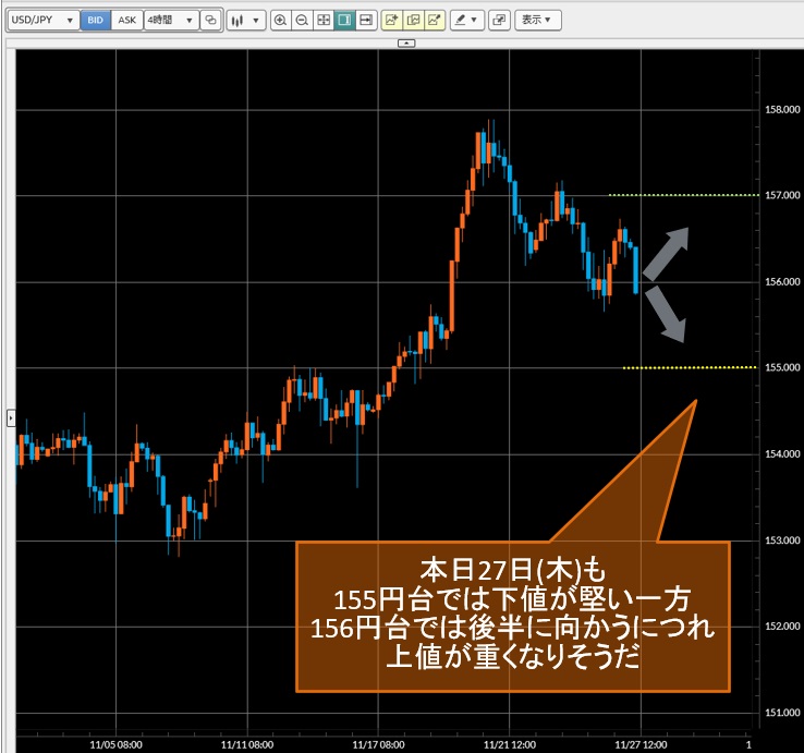 米ドル/円は本日27日(木)も155円台では下値が堅い一方、156円台では後半に向かうにつれ上値が重くなりそうだ。