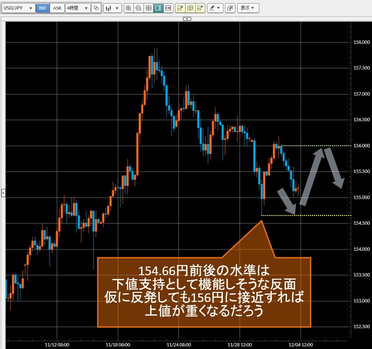 それだけに短期的な米ドル/円の下値余地は限定的とみられ、一昨日1日(月)に付けた154.66円前後の水準は下値支持として機能しそうだ。