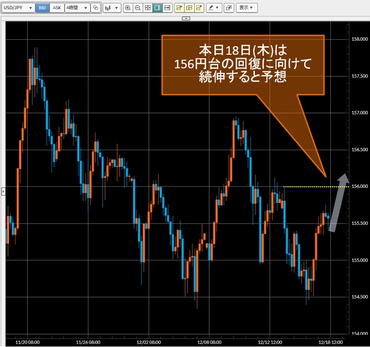 日銀の金融政策発表を明日19日(金)に控える中、本日18日(木)の米ドル/円は156円台の回復に向けて続伸すると予想。