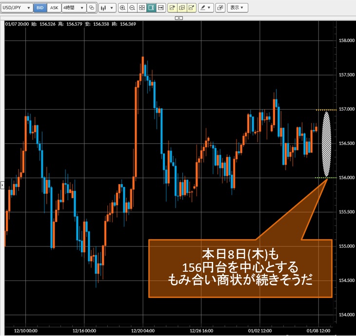米ドル/円は本日8日(木)も156円台を中心とするもみ合い商状が続きそうだ。