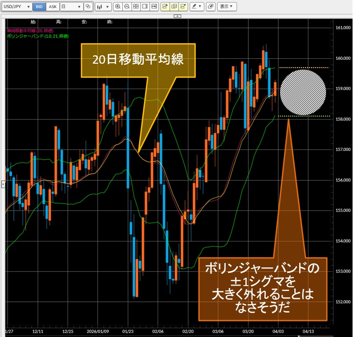 このあとも海外市場にかけてイラン情勢をめぐるヘッドラインに一喜一憂する場面はあるだろうが、20日移動平均線(158.97円前後)を中心とするボリンジャーバンドの±1シグマ(158.22~159.73円前後)を大きく外れることはなさそうだ。