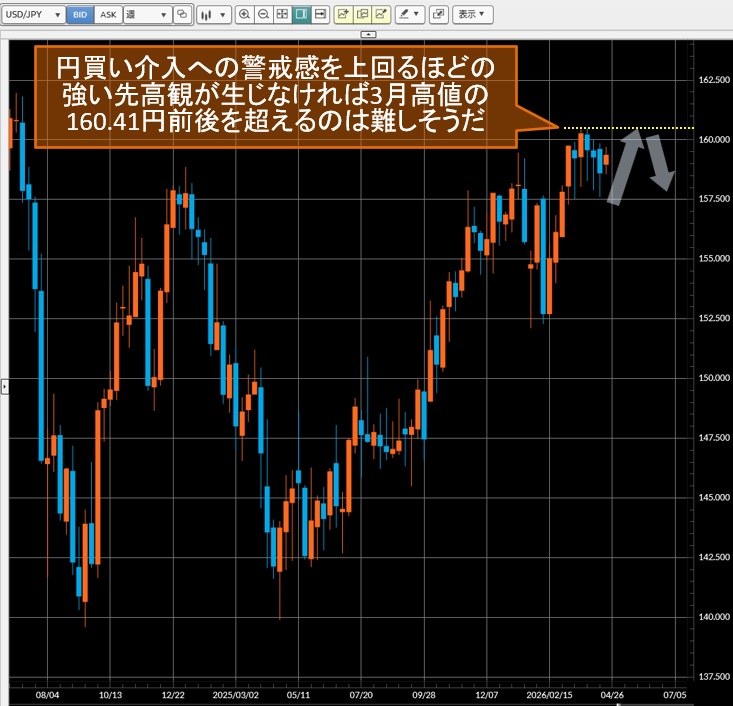 政府・日銀による円買い介入への警戒感を上回るほどの強い先高観が生じなければ3月高値の160.41円前後を超えるのは難しそうだ。