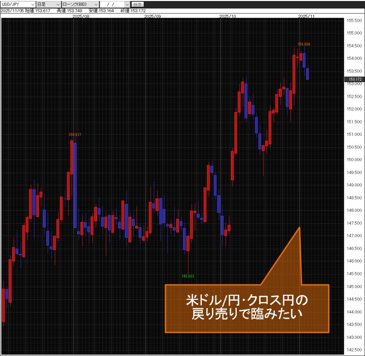 片山さつき財務相が為替動向について「足元はかなり一方的で、急激な動きがみられている」とコメントしたこともあり、米ドル/円は153.40円近辺まで反落。