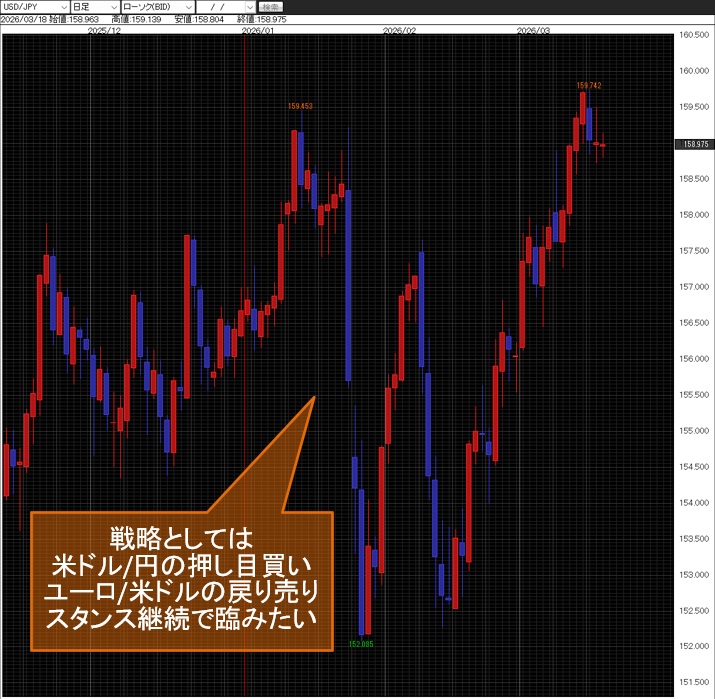 戦略としては、米ドル/円の押し目買い、ユーロ/米ドルの戻り売りスタンス継続で臨みたい。