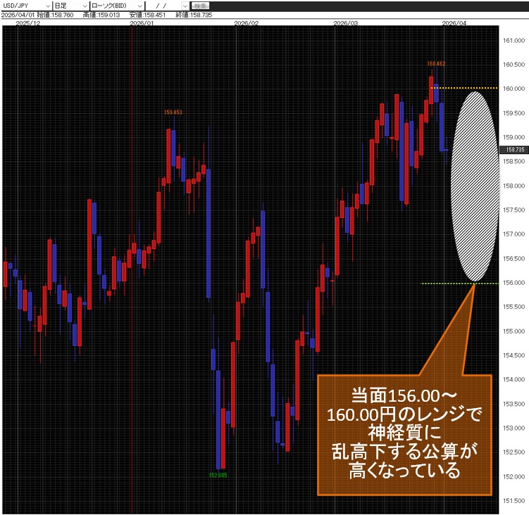 当面156.00~160.00円のレンジでの神経質に乱高下する公算が高くなっている。