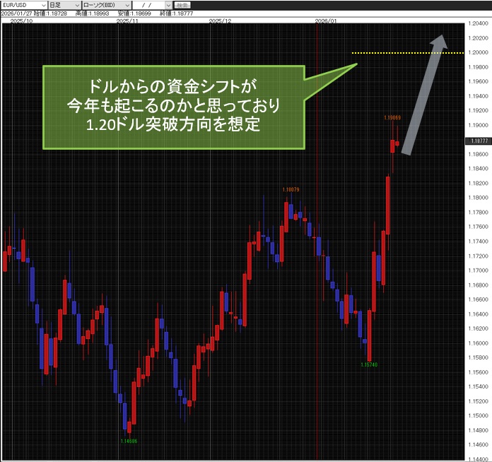 ユーロ/米ドルで1.20ドル突破の方向を想定していきたい。