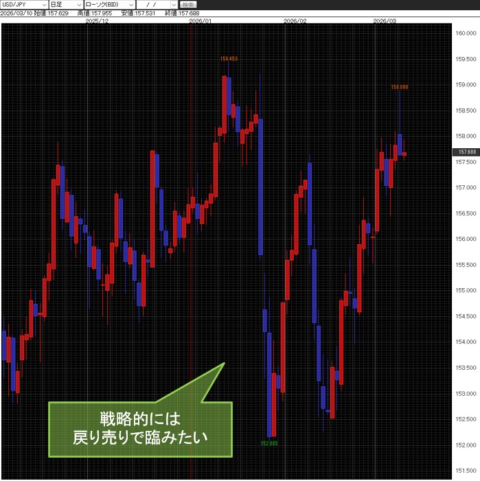 よって、戦略としては米ドル/円の戻り売りで臨みたい。