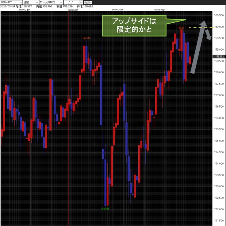 そうなるとまた原油価格がそれなりに上昇し、株価が低迷するマーケットになるだろう。円に関しては米ドル/円の160円に近いところはどうしても介入警戒感が強まるため、それ以上上がらなくなってきている。