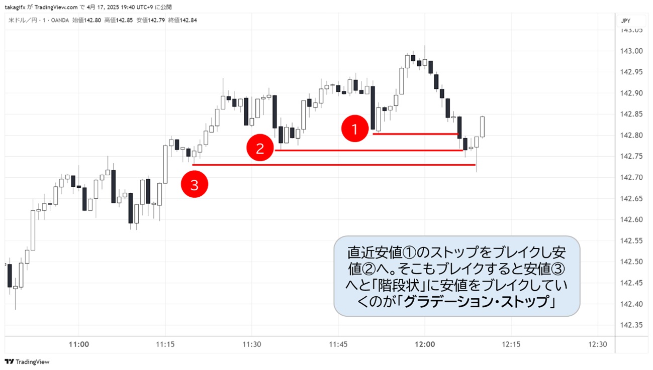 「ちょうど数分前の場面もそうでした。142.80(チャートの①)に直近安値があり、その左側にも②や③といった小さな安値が並んでいます。こういうとき『①をブレイクして下げたら②、さらに③まで貫通するかもしれない』と考えて売ったりします」