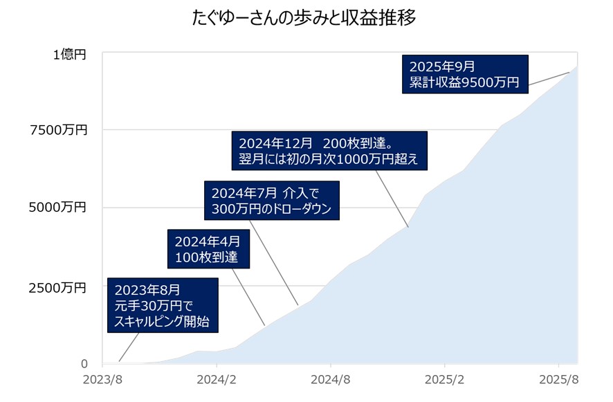 専業トレーダー。2018年にFXを始めるも、情報商材に騙されるなど5年間は鳴かず飛ばず。2023年、ナナキFXさんのYouTube配信をきっかけにスキャルピングへスタイルを転向。初月からプラスとなるなど順調に収益を伸ばし、2025年9月までの収益は9500万円。noteの記事『最短で100枚に行く』はXで話題に。