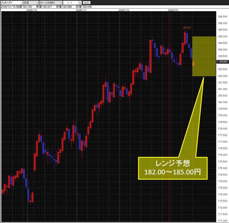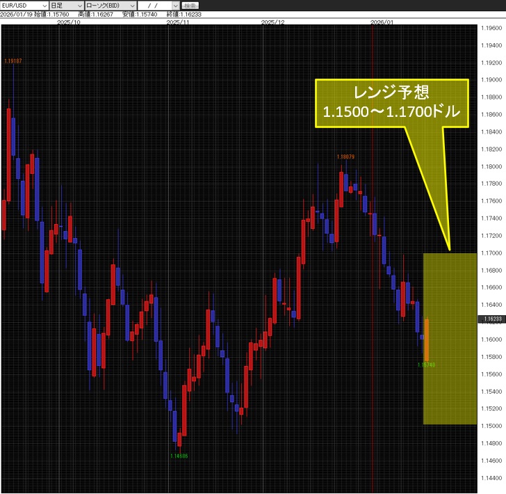 週明けは、「トランプ氏のデンマーク自治領グリーンランドの取得に関し、ユーロ圏が反対を表明。これに対抗して同氏がユーロ圏8か国に10%の追加関税と発表」。