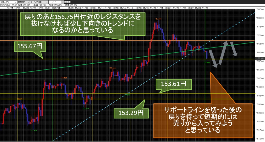 戦略としては、米ドル/円がサポートラインを切った後の戻りを待って、短期的には売りから入ってみようと思っている。