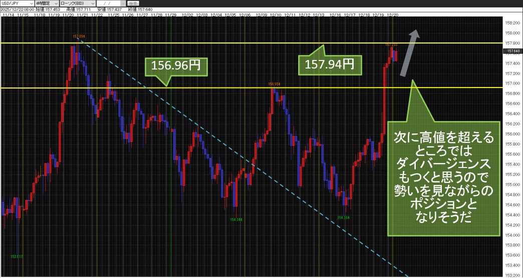 米ドル/円は、157円がここからもサポートとして意識されるレベルということで、このサポートを割らない限りは、まだまだ円安が続くかと思う。また、11月20日に付けた高値にもあと少しで届きそうだ。
