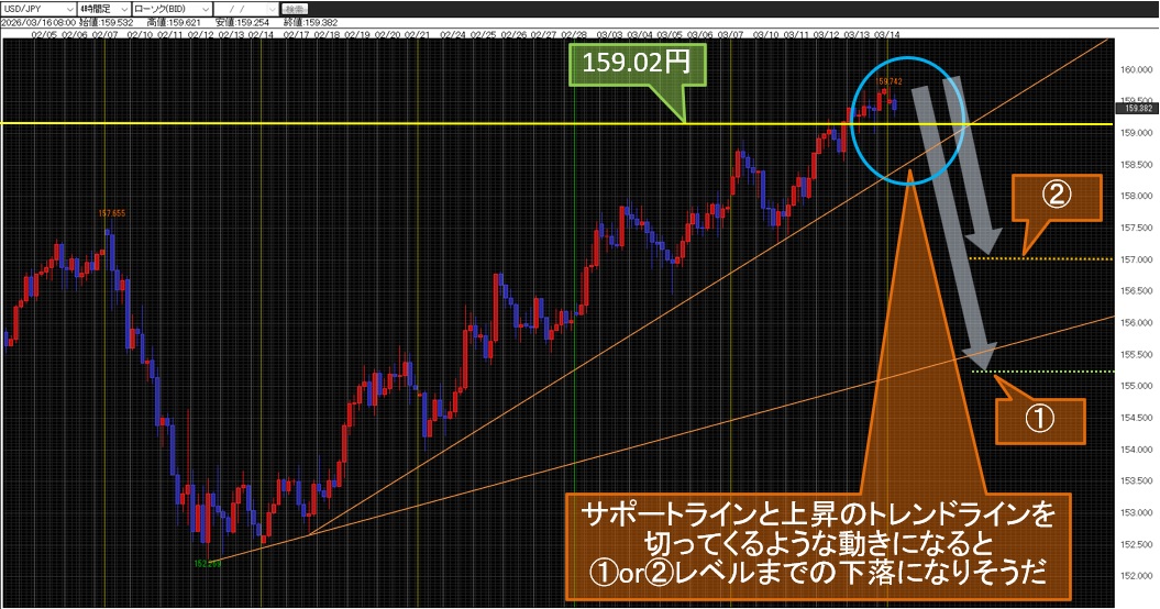 ここから159円付近にあるサポートラインと上昇のトレンドラインを切ってくるような動きになると大き目の下落になりそうだが、トレンドラインの切り方に注目したい。