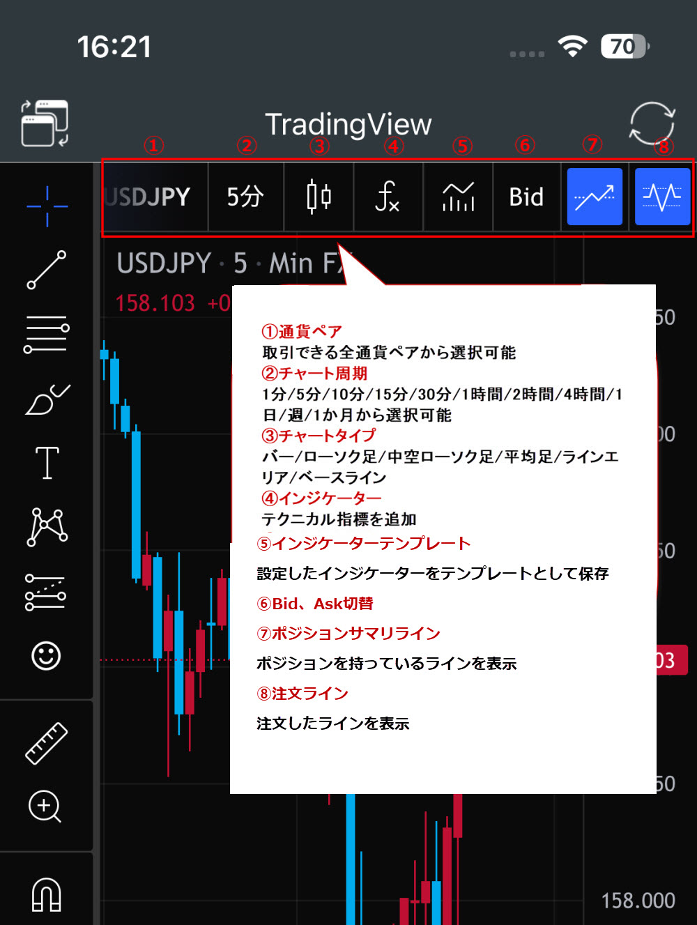 トレイダーズ証券のスマホアプリ版は手軽にTradingViewが使え、機能も充実しています。