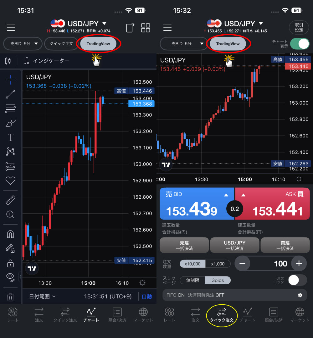 ティックチャートの表示ができます。また、スマホアプリでは、スピード注文の際にもTradingViewチャートを表示させることができます。